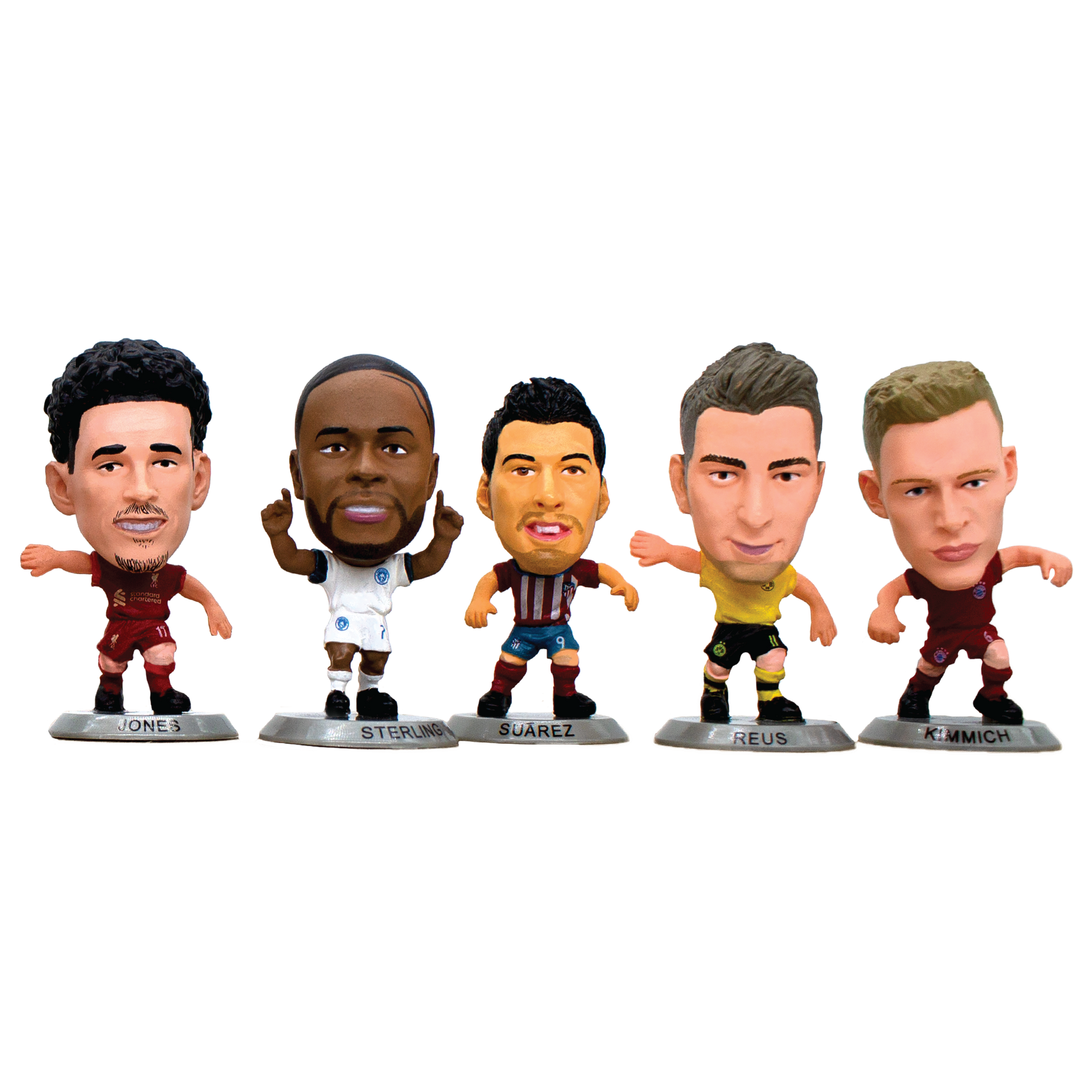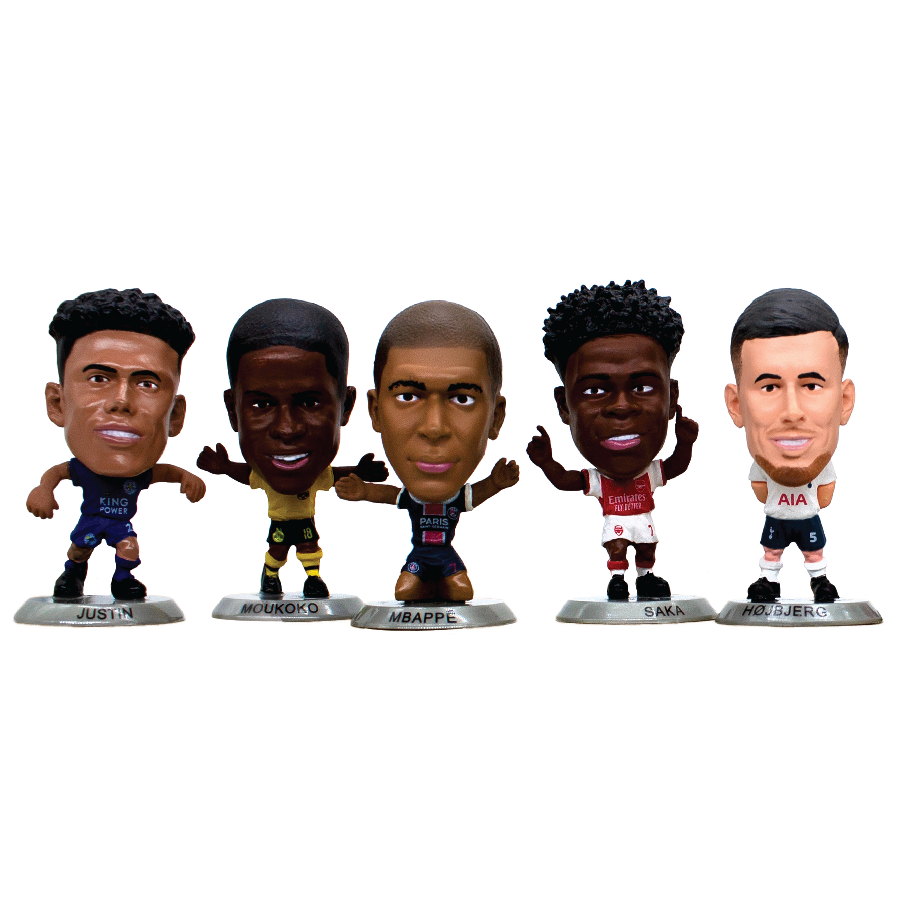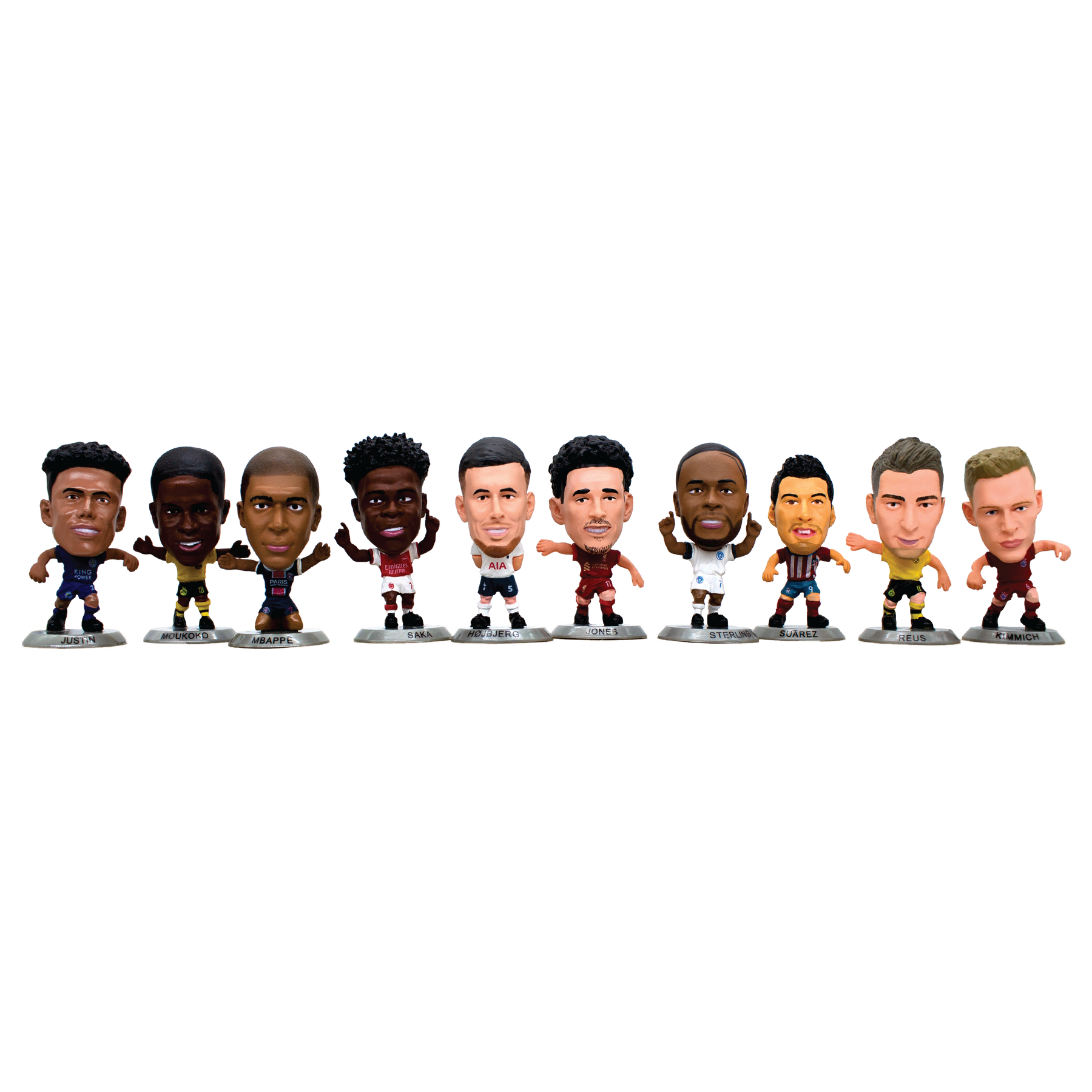 This 10-figure bundle includes Bukayo Saka, Curtis Jones, James Justin, Joshua Kimmich, Kylian Mbappé, Luis Suarez, Marco Reus, Pierre-Emille Højbjerg, Raheem Sterling (Away Kit), and Youssoufa Moukoko, all mounted on silver bases, exclusive to the 2022 SoccerStarz Blind Bag range.
